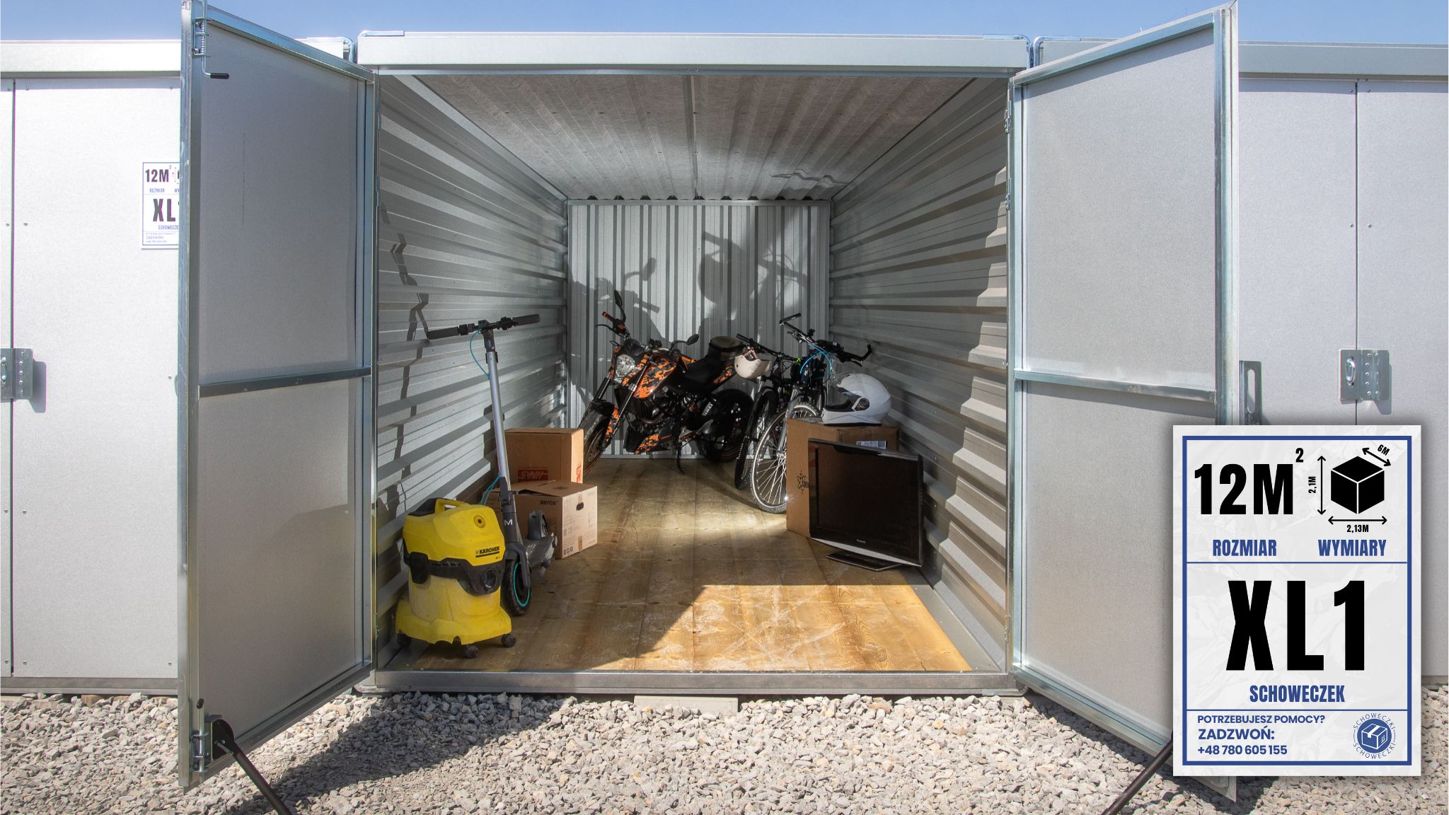 Nadaje się do przechowania: rowerów, opon, kartonów, sprzętu sportowego, rzeczy po przeprowadzce, wyposażenia firmowego.